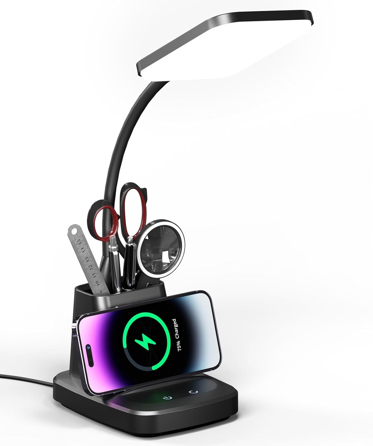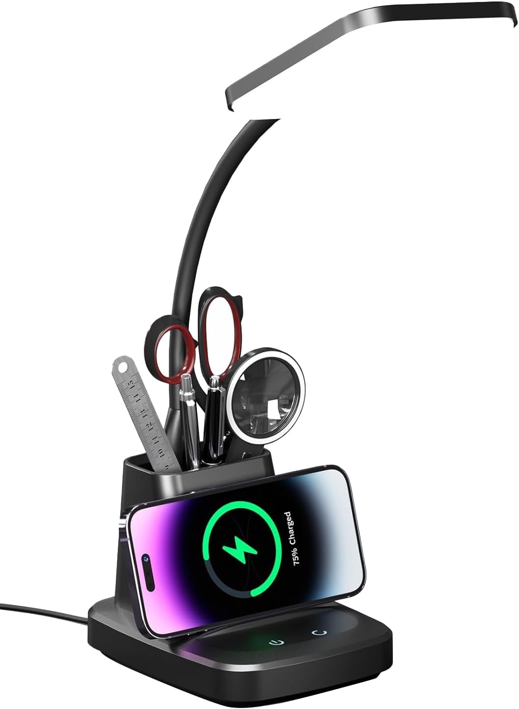- [CONVENIENT LED DESK LAMP]This adjustable gooseneck, pen holder, and phone stand dorm desk lamp is ideal for a college dorm room and has all the conveniences you could want. It performs a variety of tasks that can help you save money and space. It can store your reading glasses, a magnifying glass, multi-tools, pens, pencils, and more. Your desk will look great with a dorm desk lamp with storage.