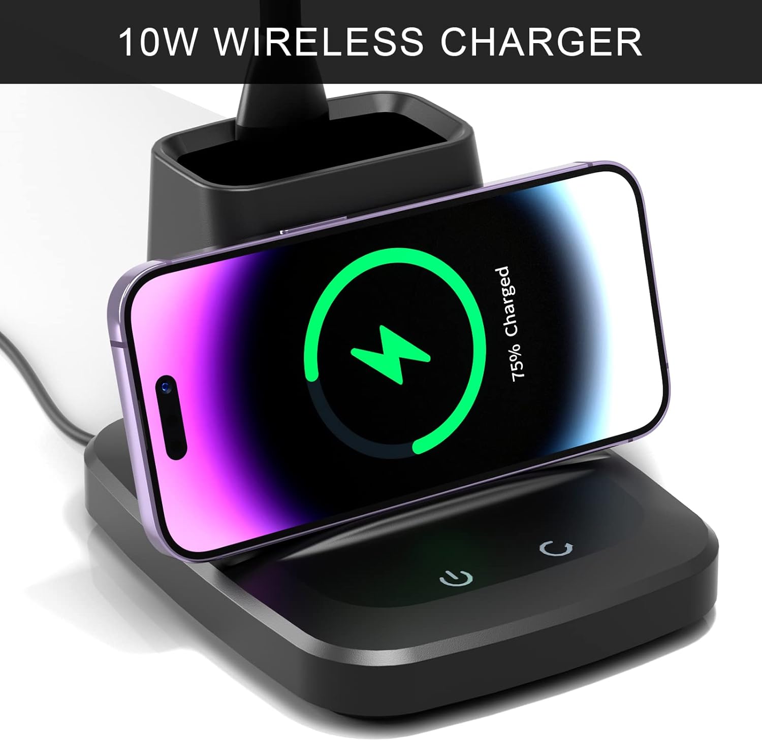 - [LED DESK LAMP WITH WIRELESS CHARGER]This wireless desk lamp charger is very practical and stylish, and it doesn't require any additional wires. The LED desk lamp comes with a 10W wireless charger that can be used to recharge wirelessly compatible devices like iPhones, Samsung, and other electronics. You can keep your phone charged while you work and never have to worry about running out of power.